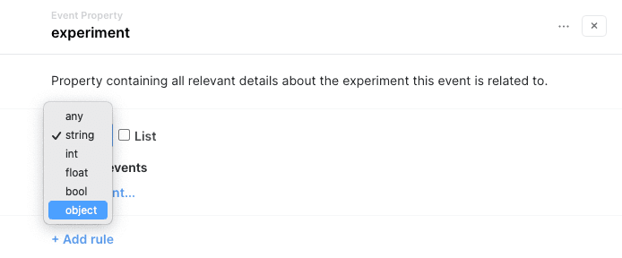 In your Avo Tracking Plan properties can have 5 different types, string, integer, float, boolean and object. Learn more about properties in general in this doc.