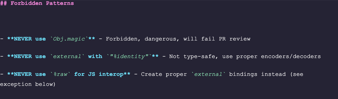 But rules are not write-only. Around rule 25, I noticed the agents starting to hedge — following one rule while half-violating another. The context window is not infinite, and contradictory guidance makes the AI cautious in the wrong places. So pruning became part of the process: merging overlapping rules, retiring ones the codebase had outgrown, and occasionally rewriting two vague rules into one precise one. The retro does not just add rules. It maintains the system.