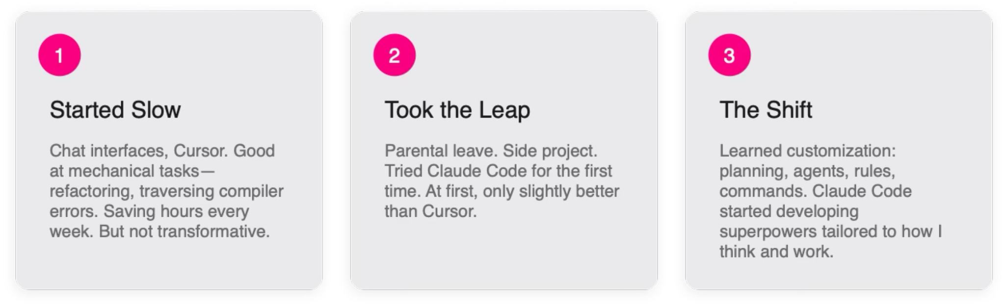 At first, AI felt like faster autocomplete. Useful, but bounded. Then I went on parental leave and started a side project, and I tried Claude Code seriously for the first time. My initial reaction was underwhelmed. It was slightly better than what I was used to, but not in a way that changed how I worked.