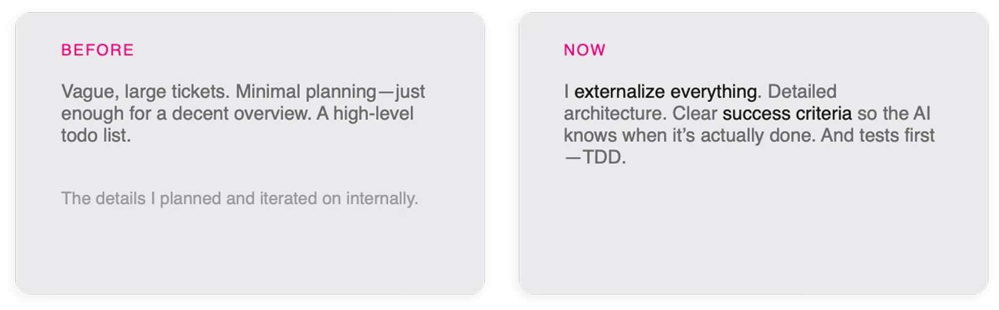 This sounds like it would slow you down. It does, at the beginning. But it shifts the time to the highest leverage place. All the effort you used to spend iterating mid implementation gets pulled forward into planning and defining “done.”