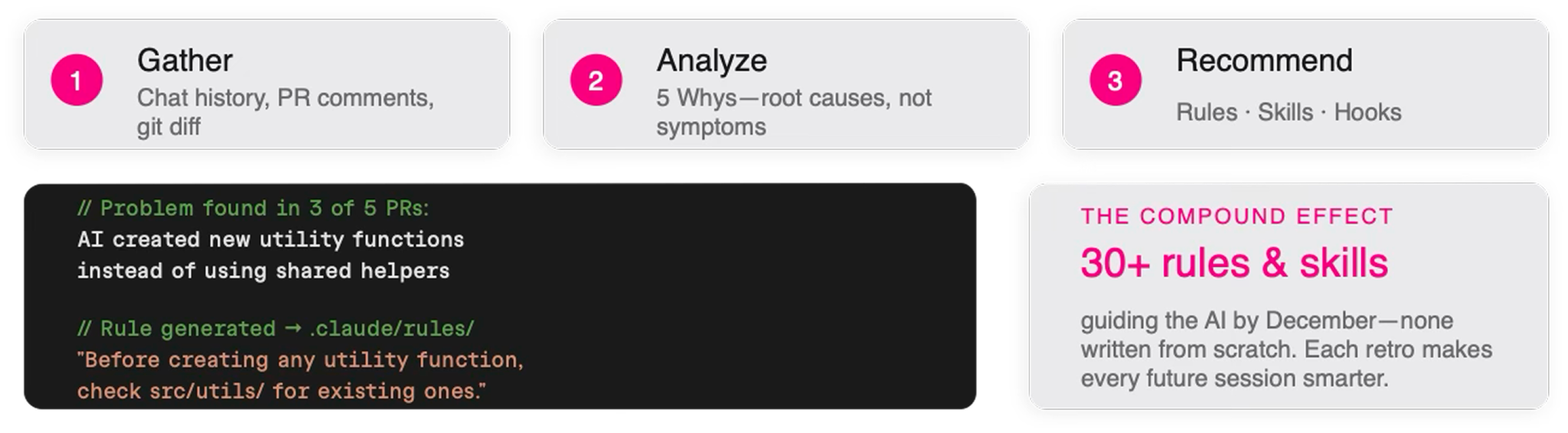 After every merge, I run a retro that gathers the chat history, PR comments, and the git diff. Then it looks for root causes, not symptoms, using a simple 5 Whys style analysis. Finally it outputs recommendations: new rules, new skills, new hooks.