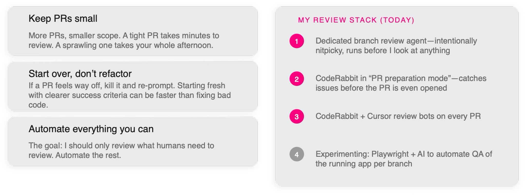 Keeping PRs small is non-negotiable. More PRs, smaller scope. A tight PR takes minutes to review. A sprawling one takes your whole afternoon.