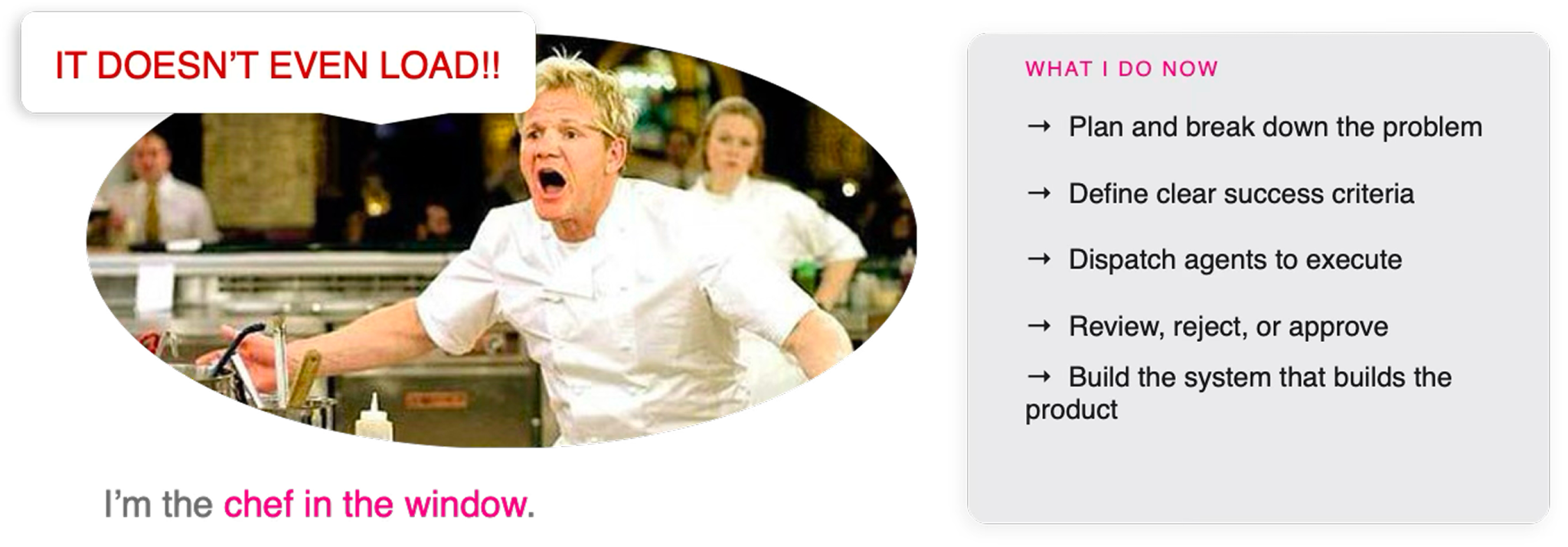 In practice, that means breaking problems down, defining success criteria, dispatching agents, and reviewing, rejecting, or approving the output. And increasingly, building the system that builds the product.