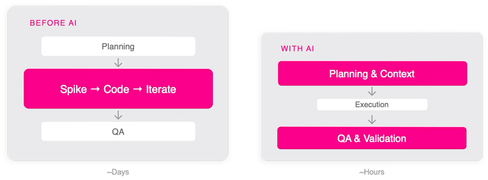 Before, the arc looked like planning, then a spike, then code, then iterate, then QA. Days disappear in the iterate loop. With agents, that loop compresses dramatically. You spend more time on planning and context, and then execution happens quickly. QA and validation still matter, but the overall wall clock time collapses.
