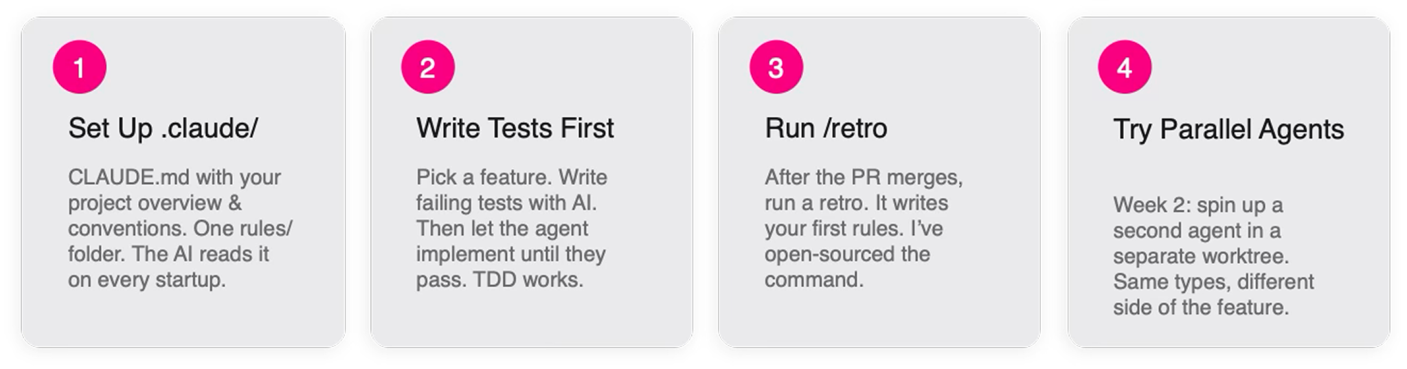 Set up a place where your project context and conventions live so the AI reads them every time it starts. Add a rules folder that you can grow over time. Pick one feature and write failing tests first. Let the agent implement it until they pass. When you merge, run a retro and turn whatever went wrong into a rule.
